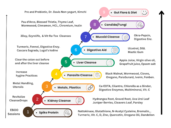We open the exits first (head-to-exit): brain/lymph → kidneys → liver/bile → gut/colon. Then we mobilize, bind, and rebuild—at a pace your body can handle. It’s not flashy. It works.